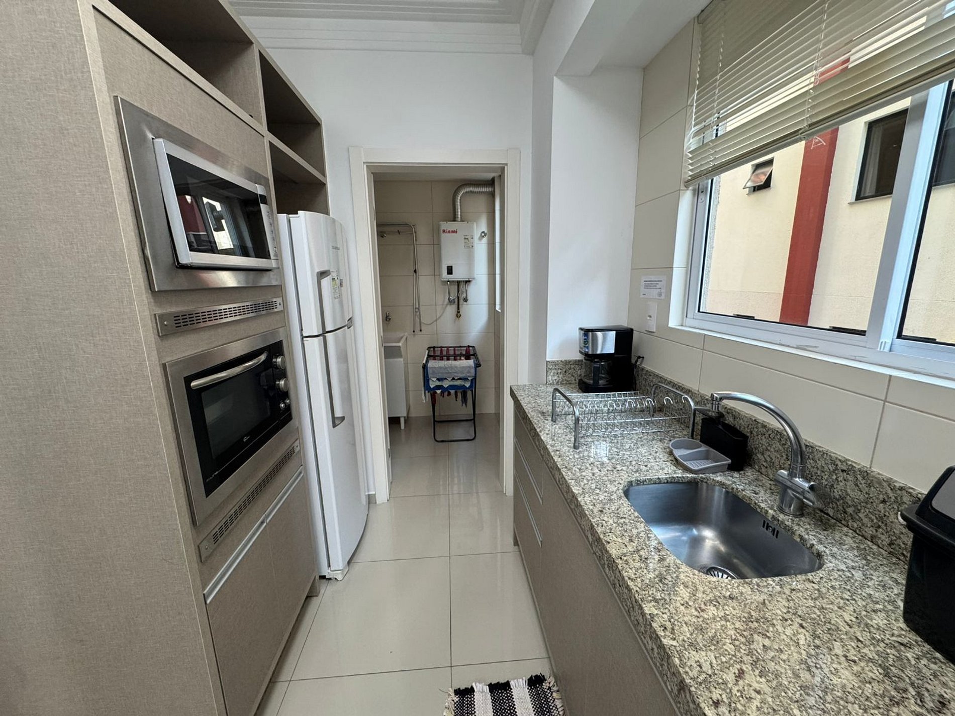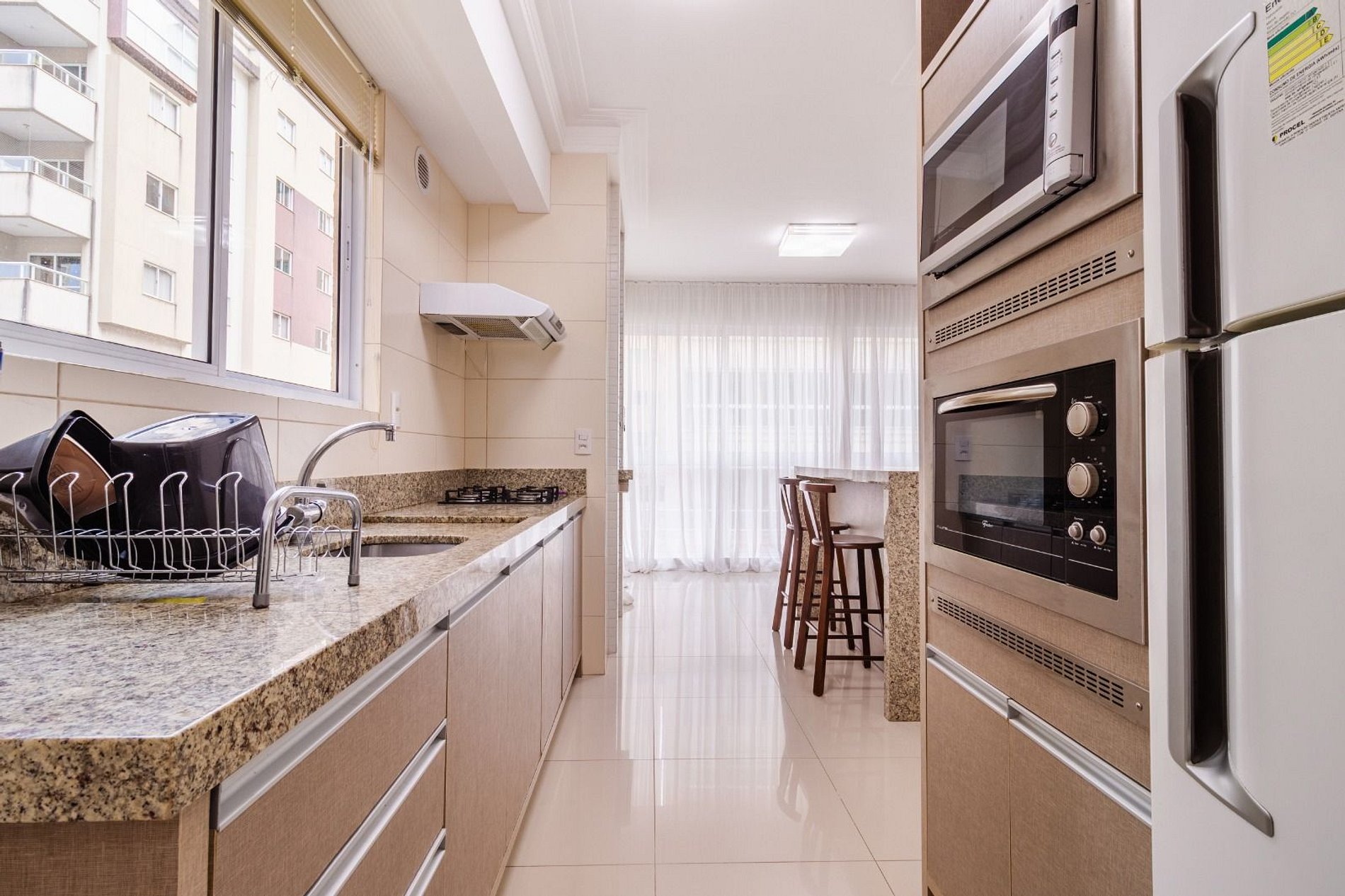 - Cozinha completa com geladeira, fogão cooktop, forno elétrico, micro-ondas, sanduicheira, cafeteira, chaleira, liquidificador, taças de vinho, panelas, louças e utensílios;