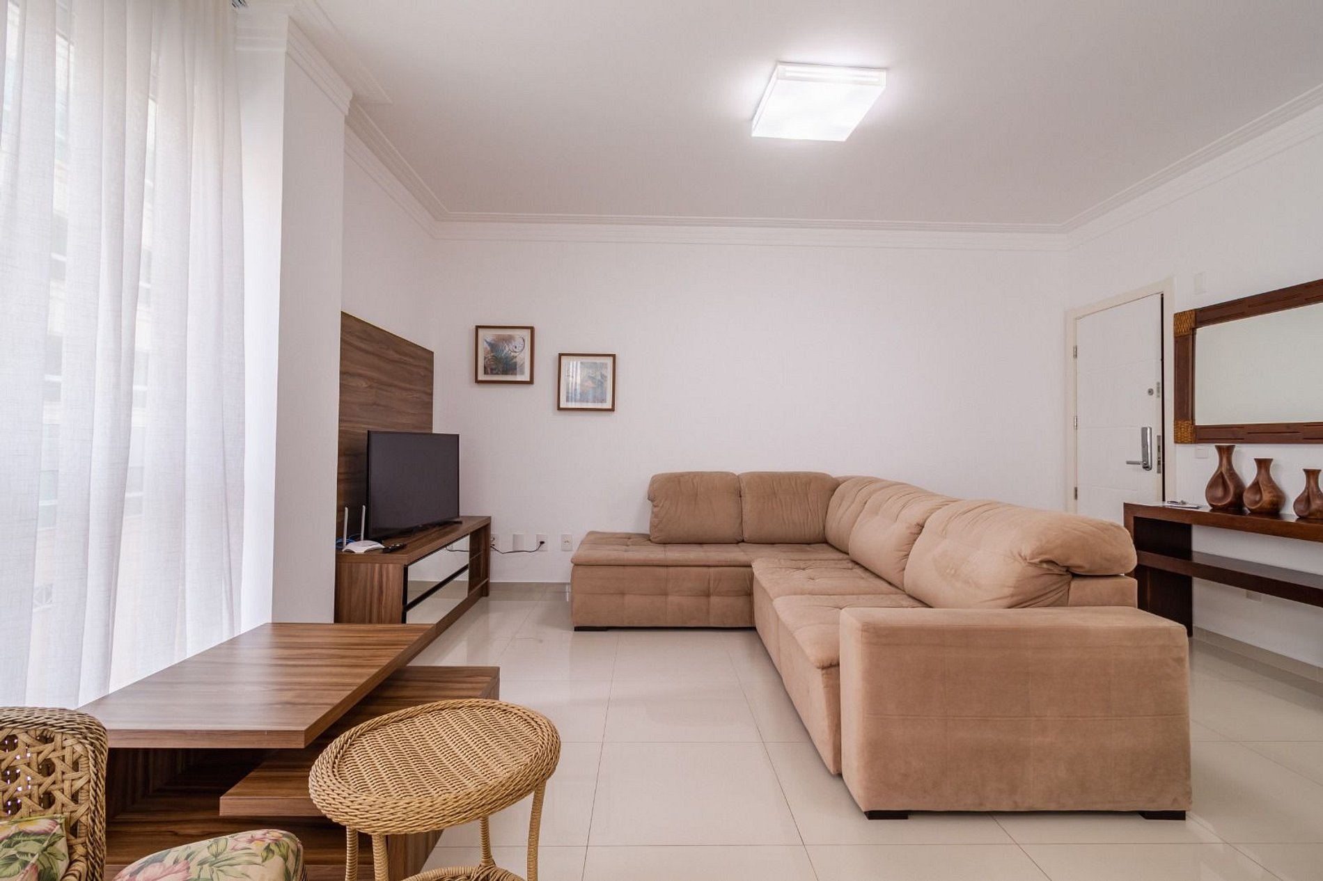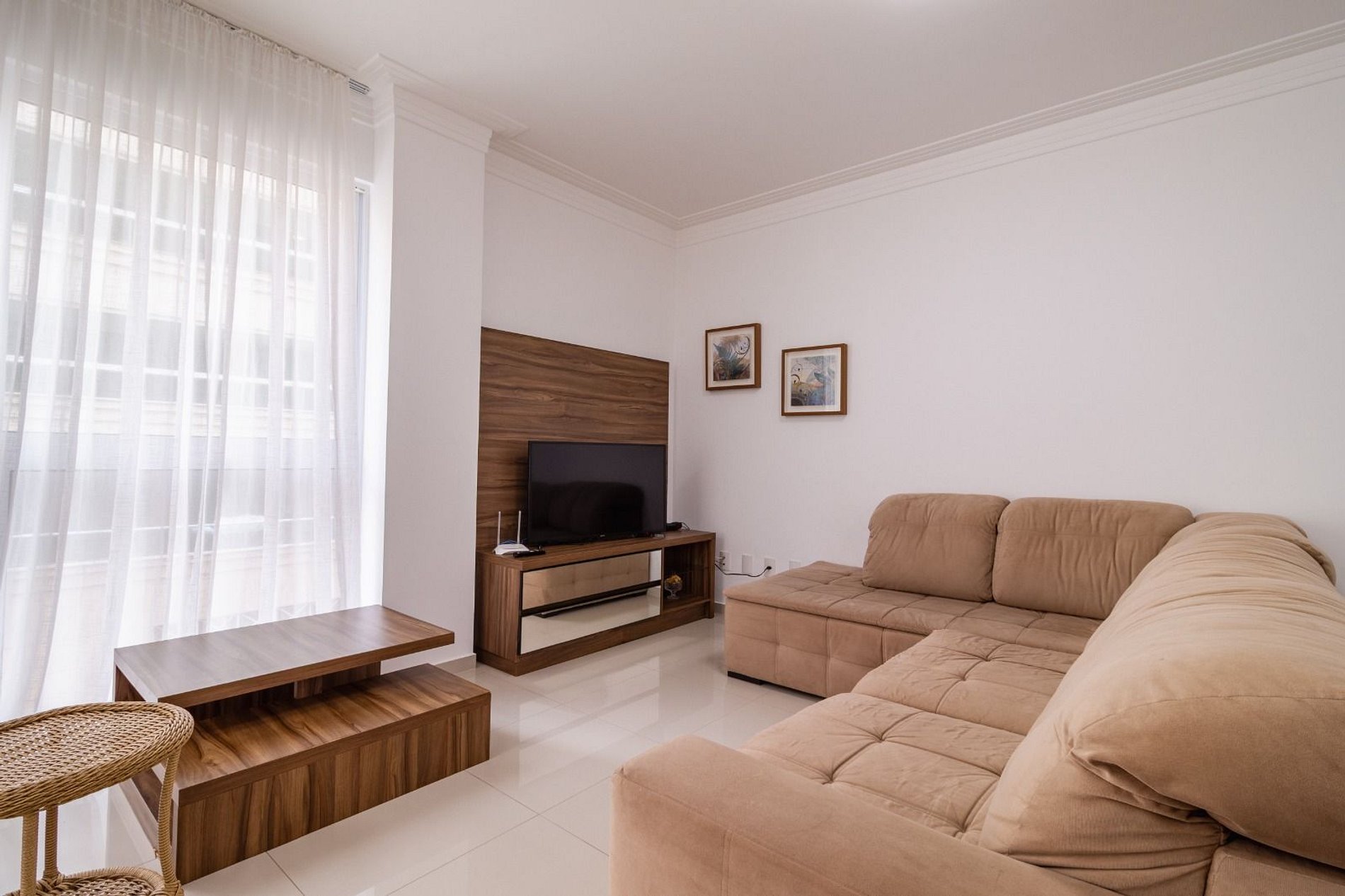 - Sala de estar com sofá e TV smart;