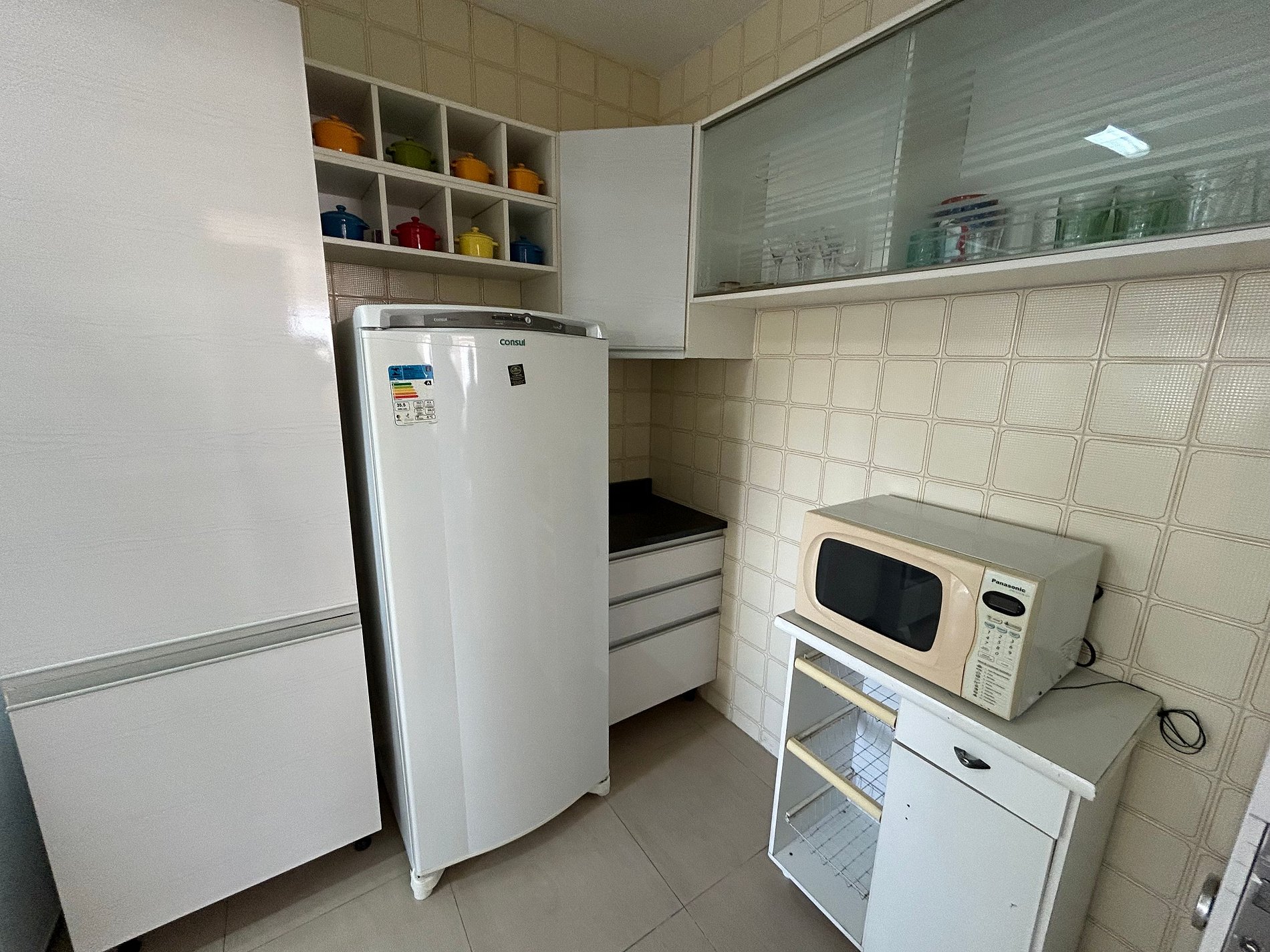 - Cozinha equipada com utensílios domésticos e eletros como, geladeira, microondas, fogão, cafeteira elétrica, sanduicheira, talheres variados e louças diversas.