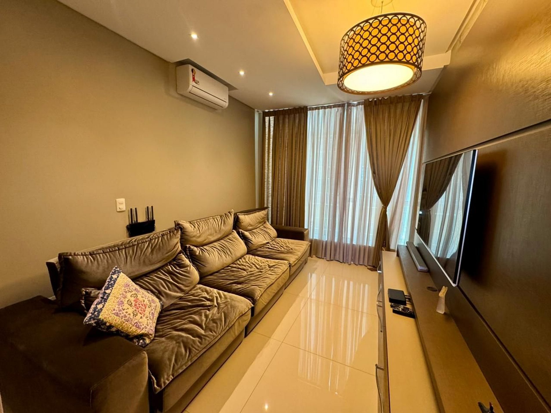 - Sala de estar com ar condicionado, sofá e TV smart;