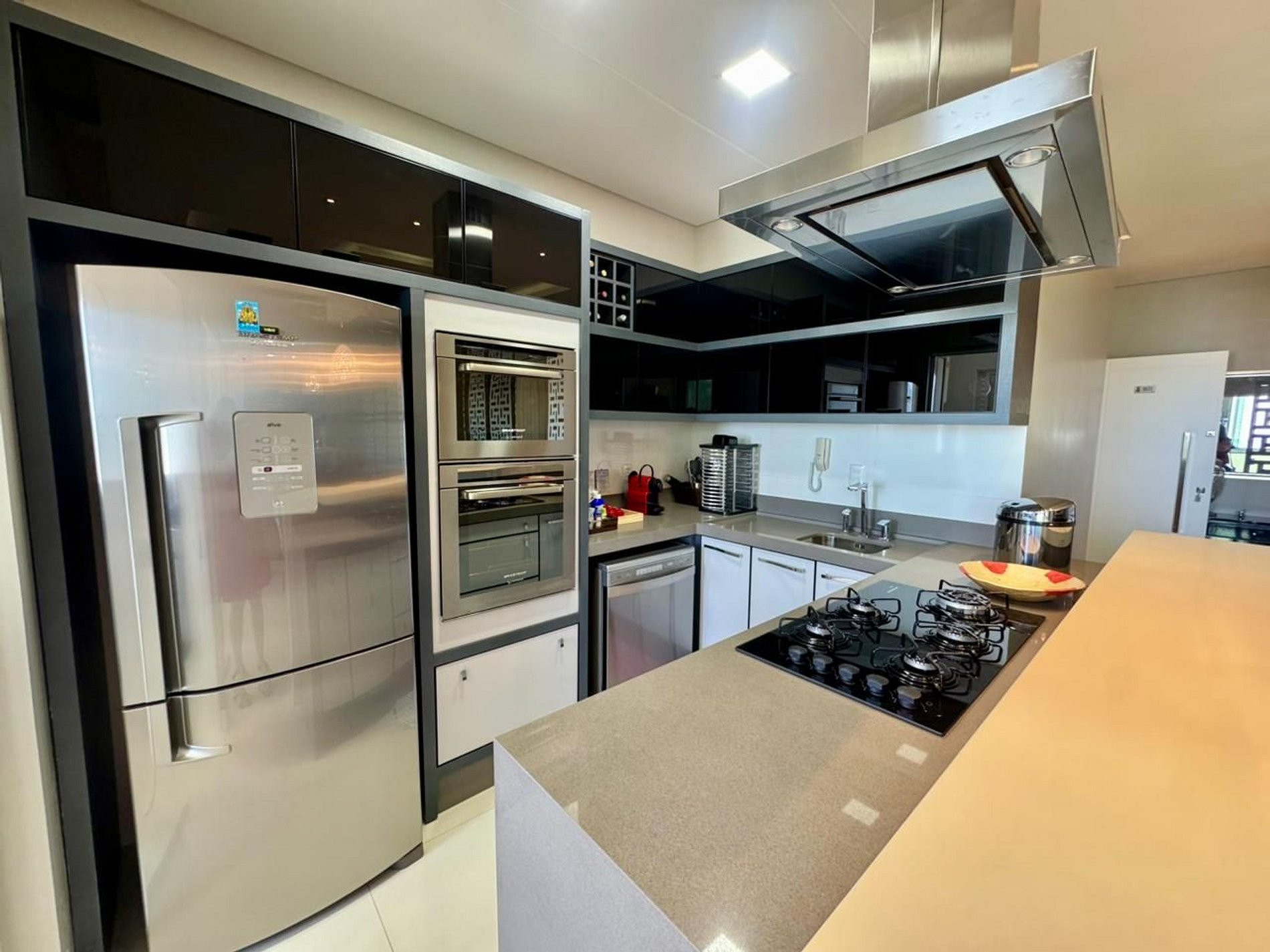 - Cozinha completa com geladeira, fogão cooktop, forno elétrico, micro-ondas, sanduicheira, cafeteira, chaleira, liquidificador, taças de vinho, panelas, louças e utensílios;