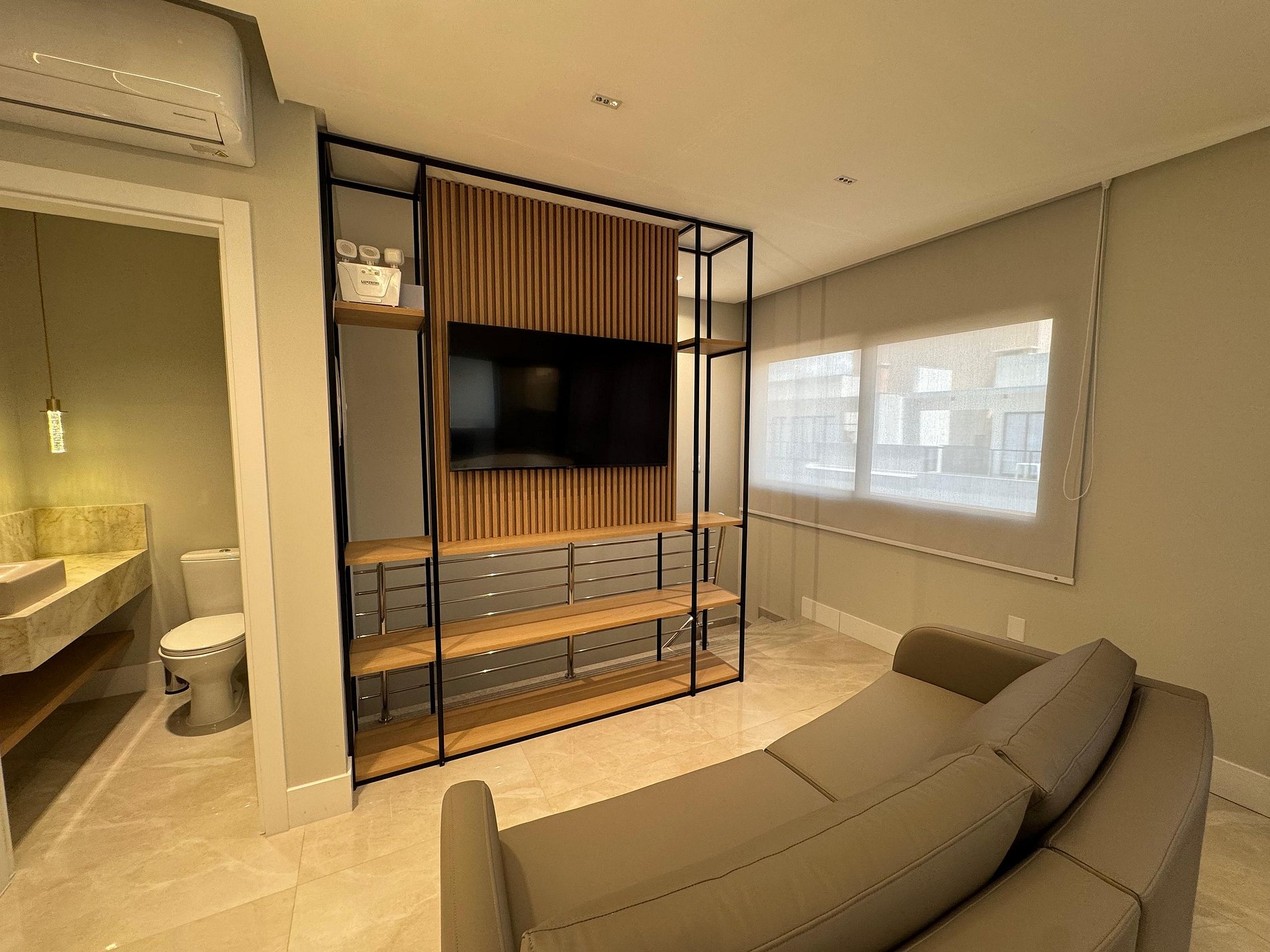 Na sala temos um confortável sofá/cama e TV Smart.