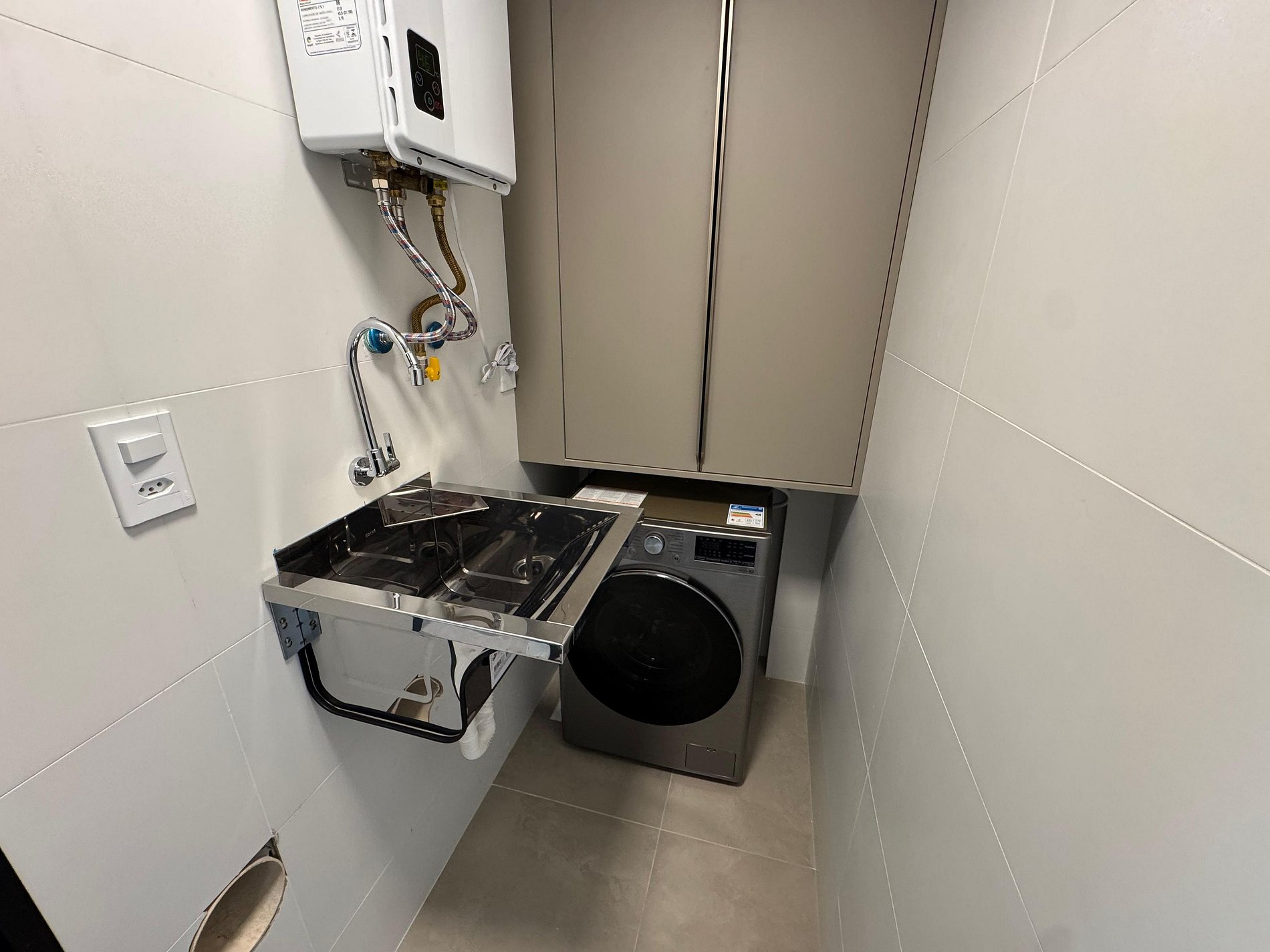 Na lavanderia temos lavadora com secadora