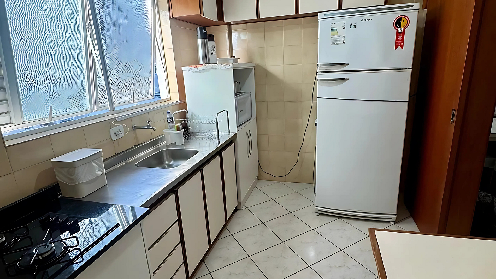 Possuímos cozinha completa, com fogão, microondas e geladeira, e todos os utensílios necessários.